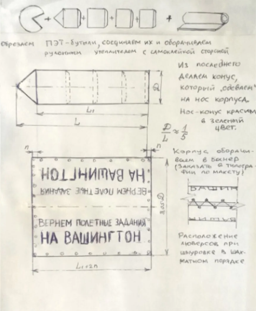 Размер баннера Вы можете подогнать под величину изготовленной ракеты, главное соблюсти пропорцию D/L=1/5. Ширина баннера равна 3,05*D , (где D- диаметр, L -длина корпуса "ракеты"), 3,05 меньше 3,14 , числа "пи", для того чтоб был просвет при шнуровании. Длина баннера равна L1+(4... 8) см., 2-4 см. - нахлесст плёнки с двух сторон (с хвоста и носа "ракеты"), зависит от длины от 1,3 до 2,5 м