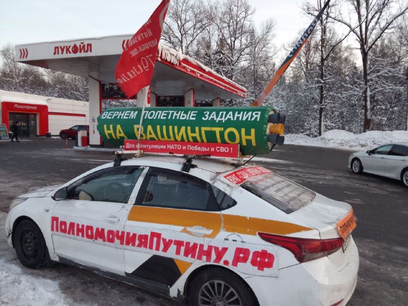 Малая модель "Сармата" , расположенная поперек корпуса авто, позволяет водителям в потоке успешно читать надпись "Вернем полетные задания НА ВАШИНГТОН!" не поворачивая головы и не отвлекаясь от движения. За счет этого малая "ракета" не уступает по эффективности модели больших размеров, расположенной вдоль корпуса авто.